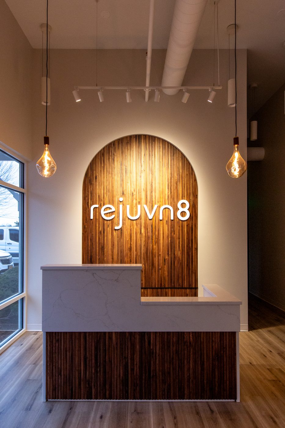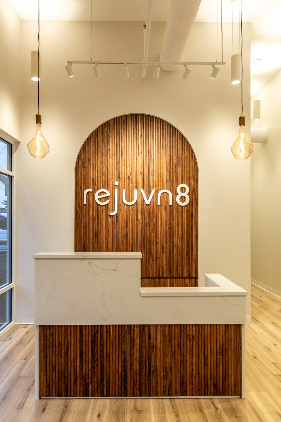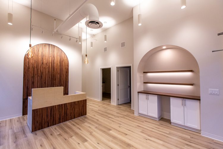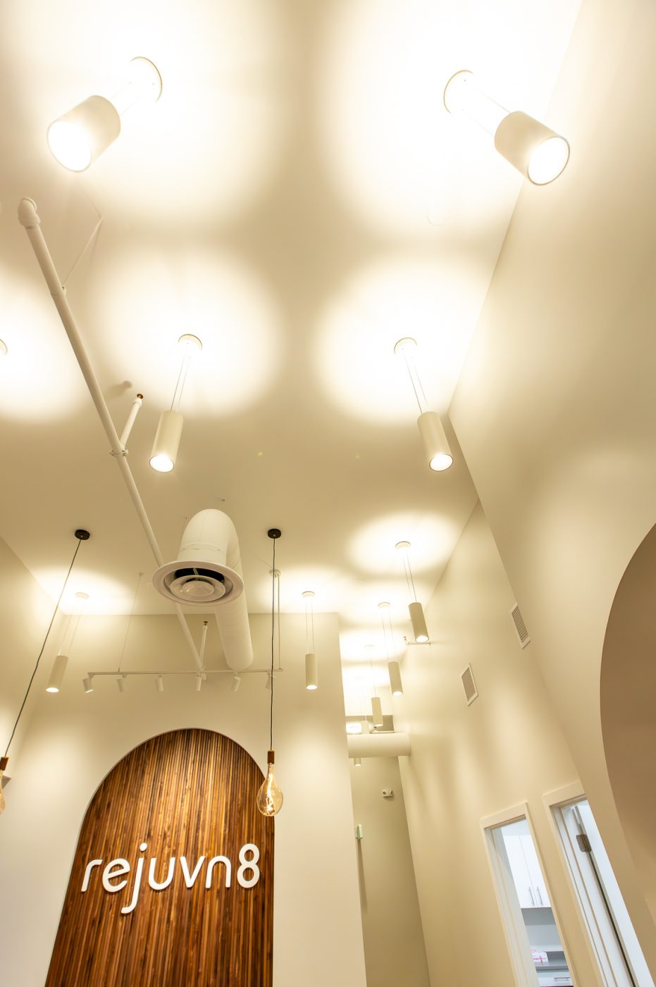 This project was a collaboration with the architect, Rinaldi, and the project’s other contractors to create a calm, refined lighting experience. Warm, low-Kelvin lighting enhances the main spaces, while brighter, shadow-free illumination supports precision in the treatment rooms. High-bay pendants provide balanced up- and down-lighting, reduce glare, and add subtle ceiling interest through varied orientations. The desk arch and logo were highlighted using theatrical lighting techniques to create focus, depth, and a welcoming sense of arrival.
