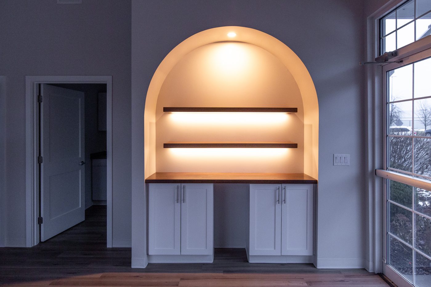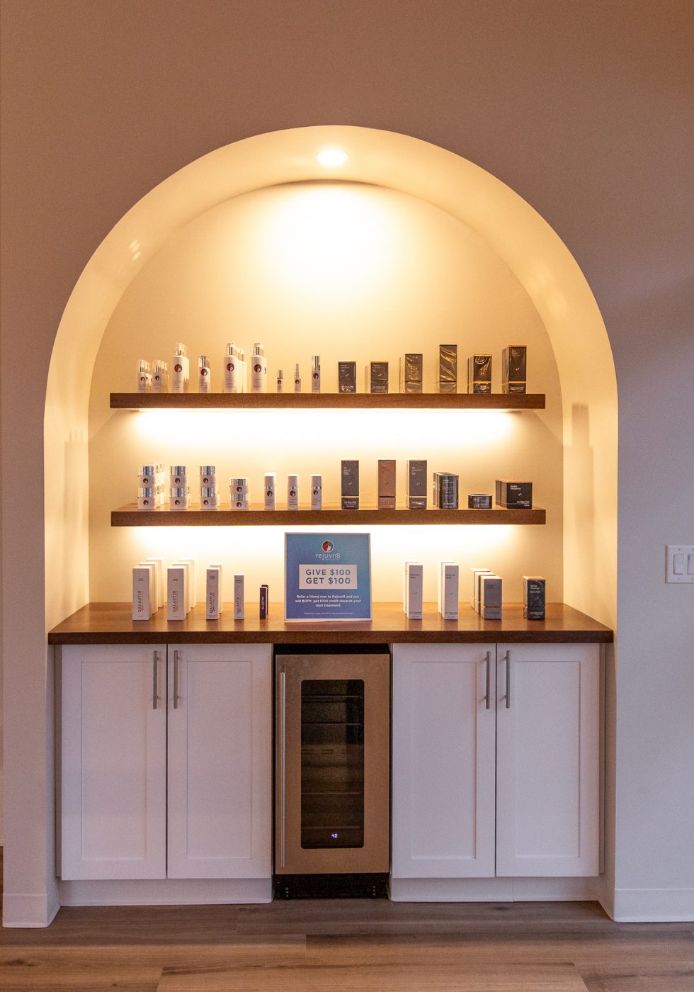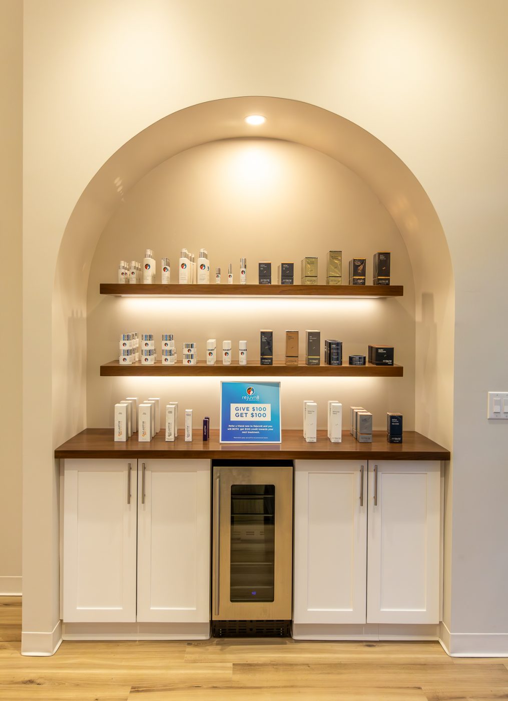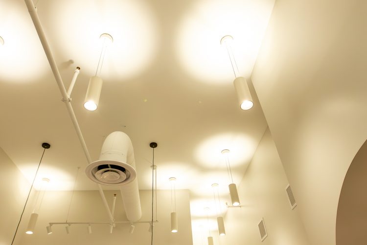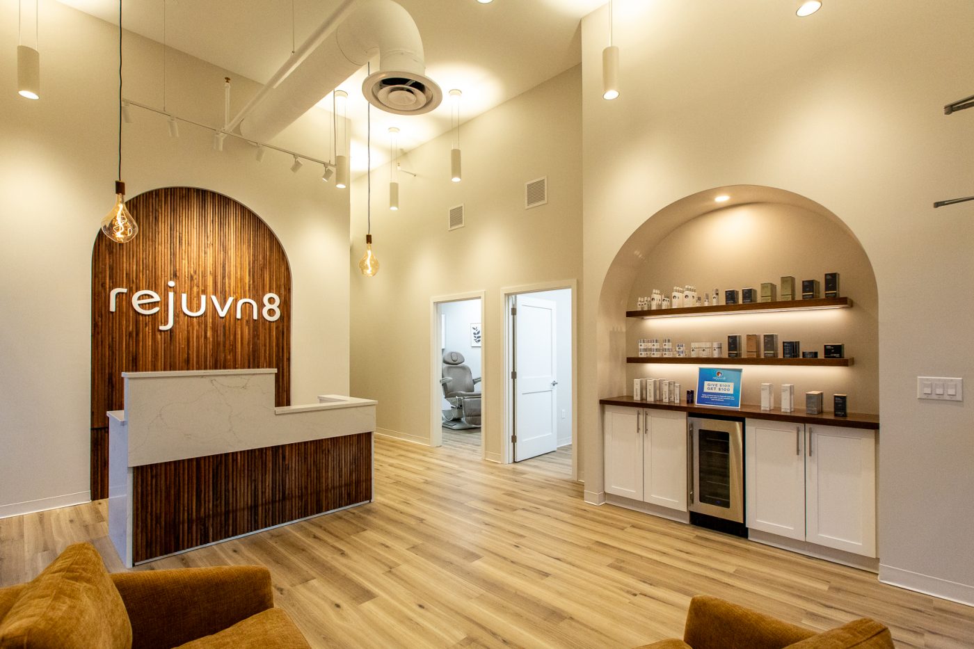 This project was a collaboration with the architect, Rinaldi, and the project’s other contractors to create a calm, refined lighting experience. Warm, low-Kelvin lighting enhances the main spaces, while brighter, shadow-free illumination supports precision in the treatment rooms. High-bay pendants provide balanced up- and down-lighting, reduce glare, and add subtle ceiling interest through varied orientations. The desk arch and logo were highlighted using theatrical lighting techniques to create focus, depth, and a welcoming sense of arrival.